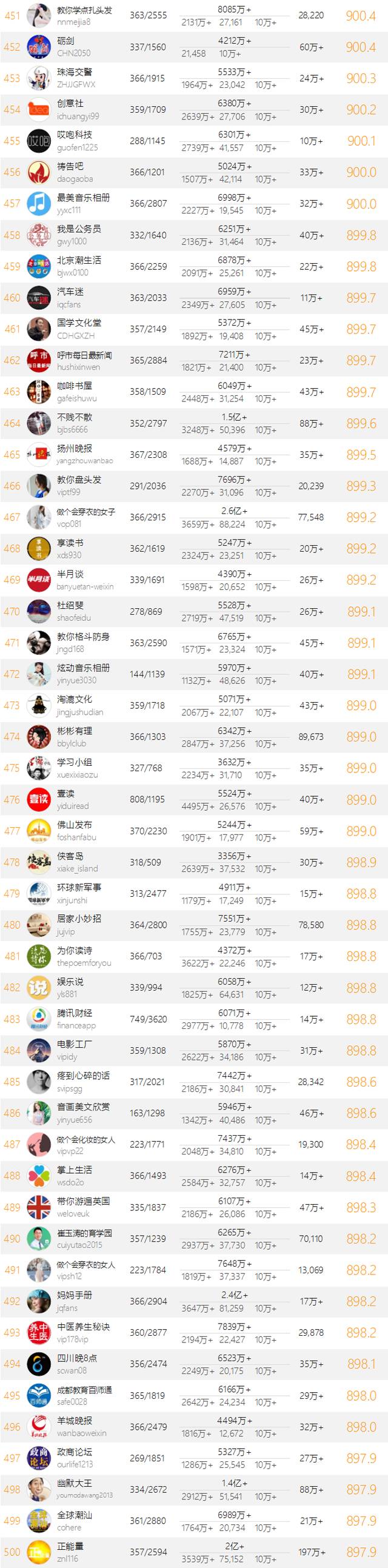 相比2015,虽然新榜指数的计算方式没有改变,公众号尤其是头部公众号还是可能受到了系统性的影响,发布数量较少且粉丝基数巨大的公众号可能由于露出阅读数较少而无缘500强。由此,在2015年入围过500强却无缘进入2016年500强的公众号并不能够被确定为运营能力下降。